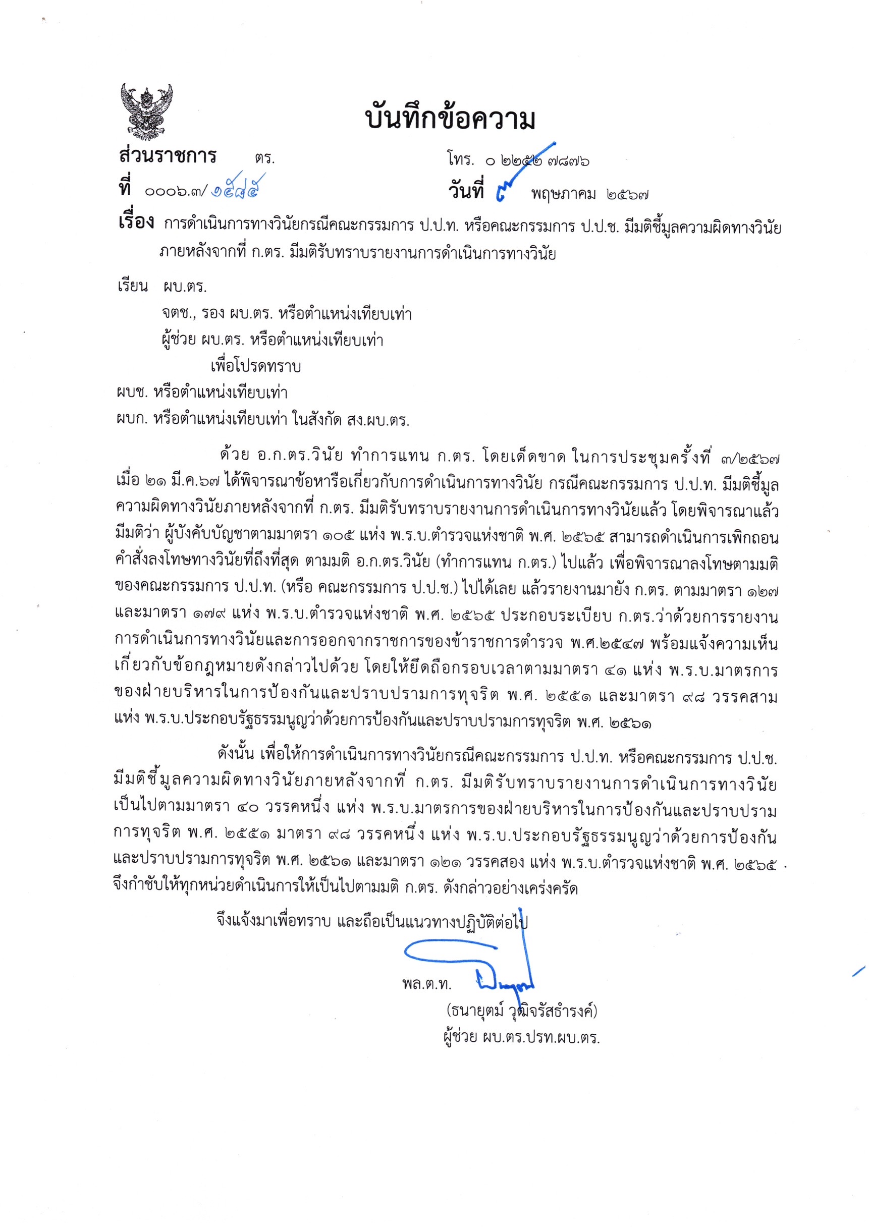 การดำเนินการทางวินัยกรณีคณะกรรมการ ป.ป.ท. หรือ คณะกรรมการ ป.ป.ช. มีมติชี้มูลความผิดทางวินัย ภายหลังจากที่ ก.ตร. มีมติรับทราบรายงานการดำเนินการทางวินัย